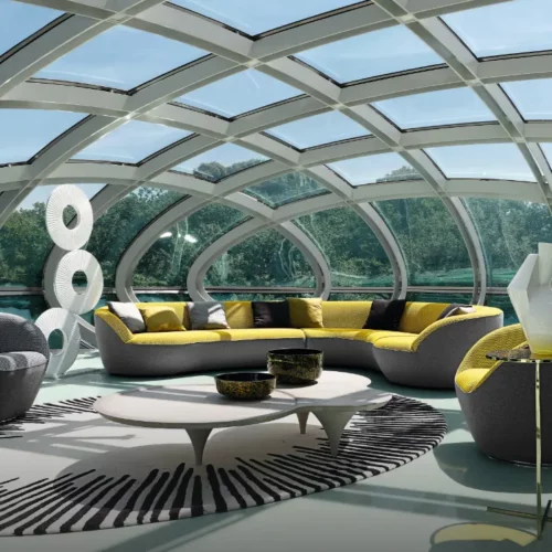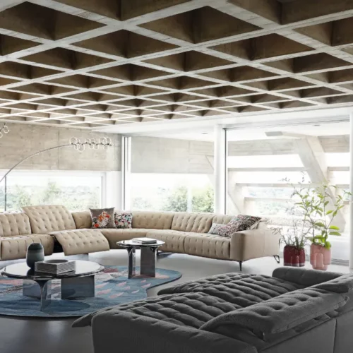 This entirely handmade sofa brings to mind a puffy cloud, and offers great comfort through its reassuring forms.