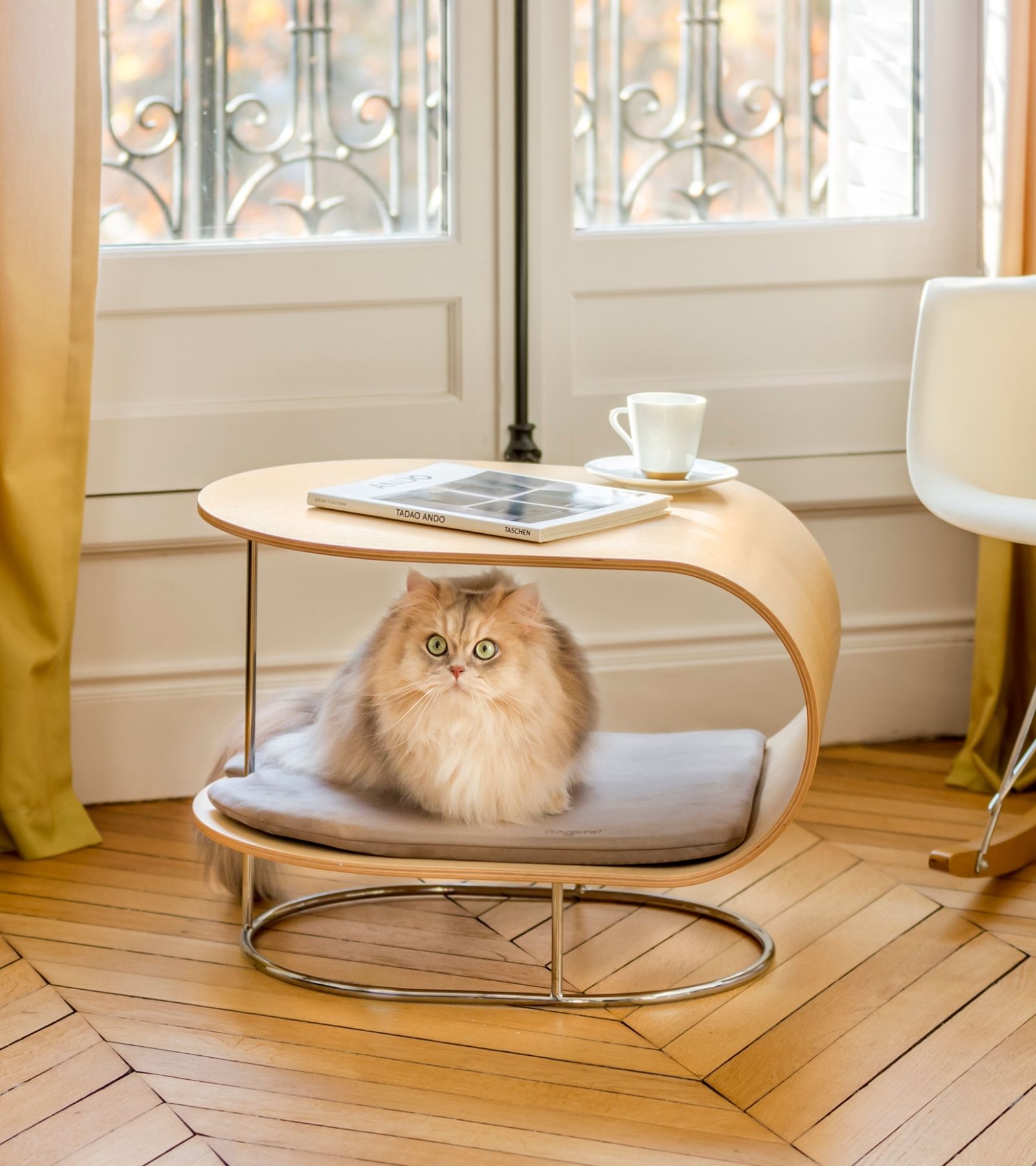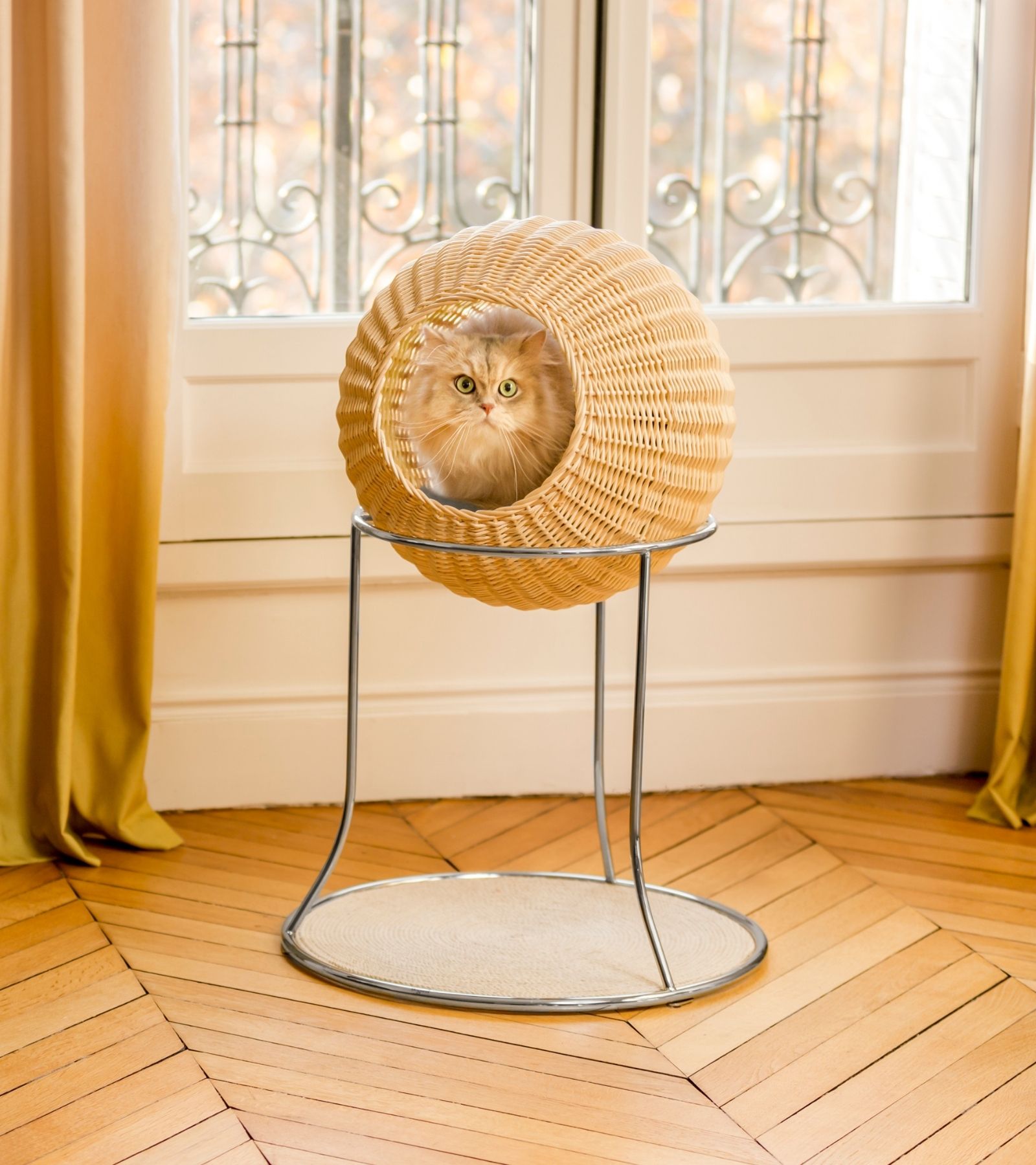 The Constellation cat tree is part of the Planetarium Collection of the cat furniture brand Bogarel. Bogarel was created in 2022 by Sacha Lakic himself, and the professional British Shorthair breeder Valérie Mounier. The cat designs are inspired by the celestial curves of the planets. Elegant and timeless, they have been designed to enhance any contemporary interior.