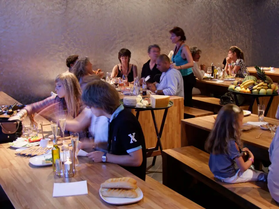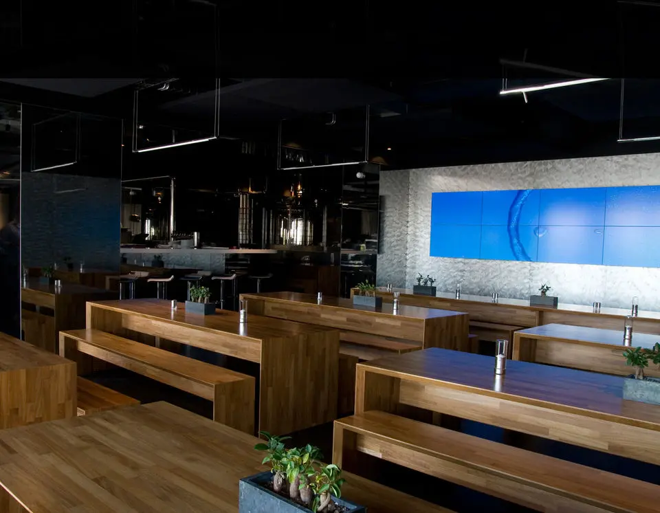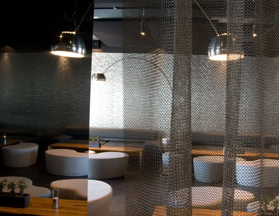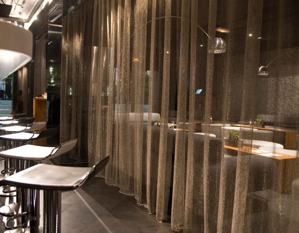The Interior is a play of differences; metal with wood, mat mixing with shinny surface, opaque merges with transparency. Smoked mirrors, metallic mesh curtains, wall video, large solid wood dining tablesm together give to this new kind of Brewery, a contemporary and high tech atmosphere.