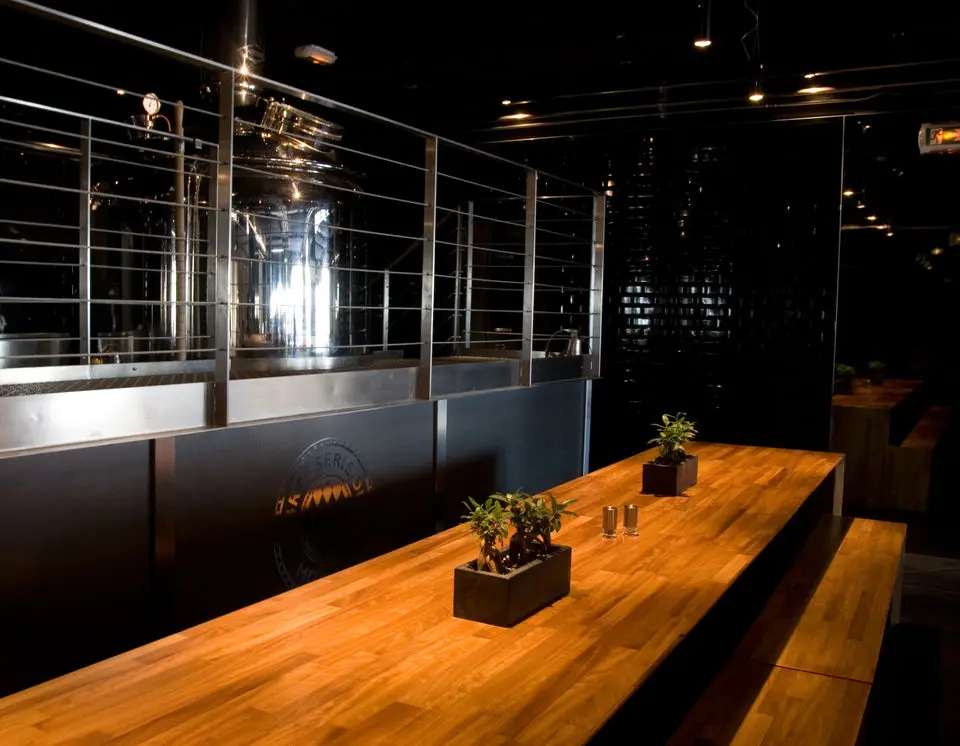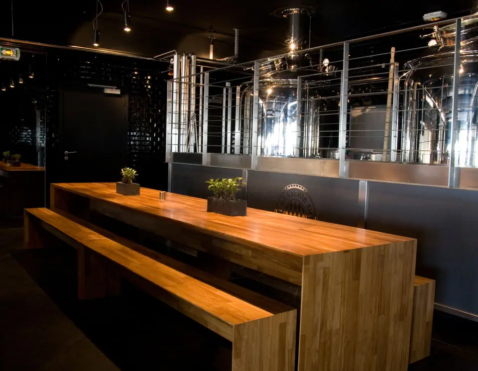 The technical elements related to the beer manufacturing such as the tanks, are part of the interior Techno/ Chic Atmosphere.
