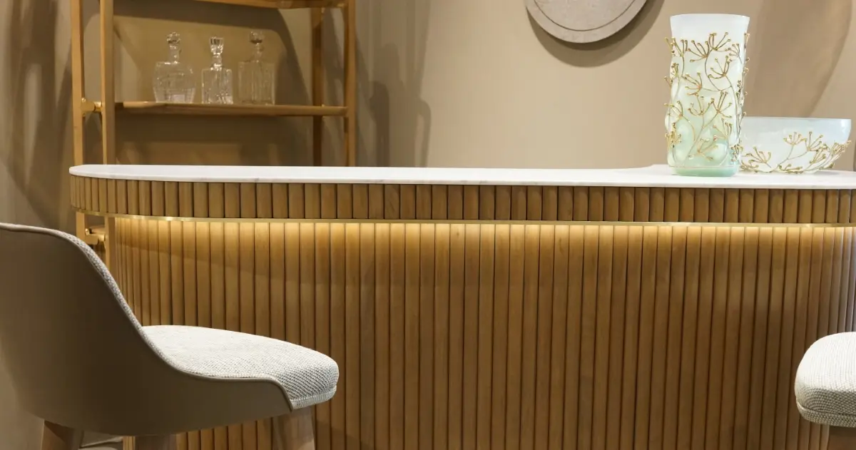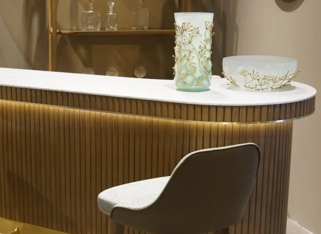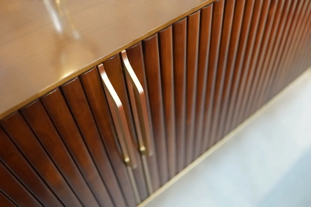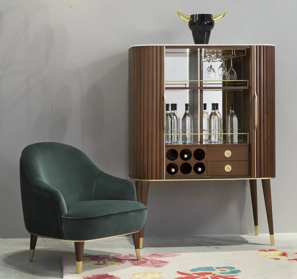 For the first time, Sacha Lakic designed a series of furniture for Roche Bobois’ Nouveaux Classiques collection. He used a mixture of influences, from the Louis XVI style to the industrial furniture of post-war America. Carrara marble evokes opulence, luxurious cherry wood slats create rhythm, and solid brass offers subtle shine throughout the entire collection.Structure in stained solid cherry wood. Top in Carrara marble with water-repellent varnish finish. Applications and feet in brushed brass.