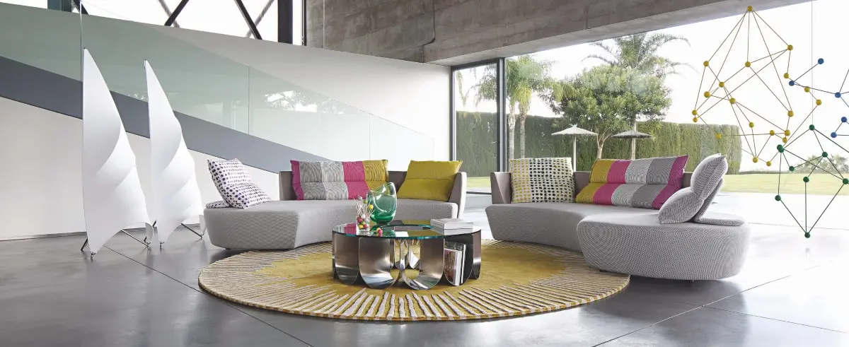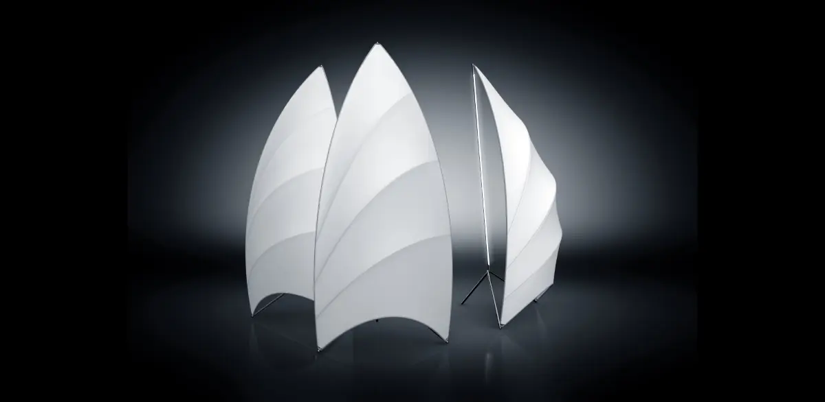 The GRAND VOILE lamp. A tensile fabric has been stretched over the dynamic arches of the rigid structure, providing an elevated shape.
