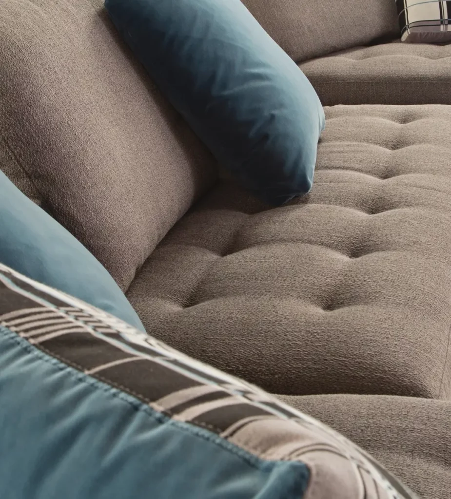 It features generous padded seats and a row of scatter pillows in various sizes and a choice of fabrics.