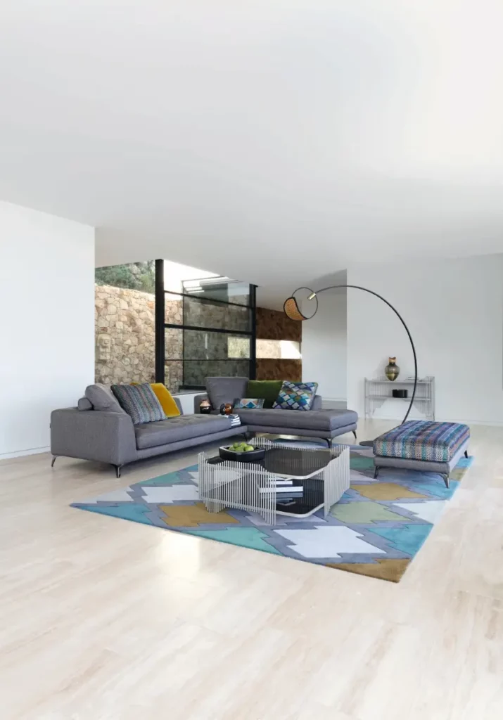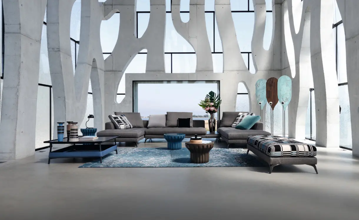 The elements are available in different dimensions; large chaise longue, armless sofa, corner and end units with an associated ottoman.