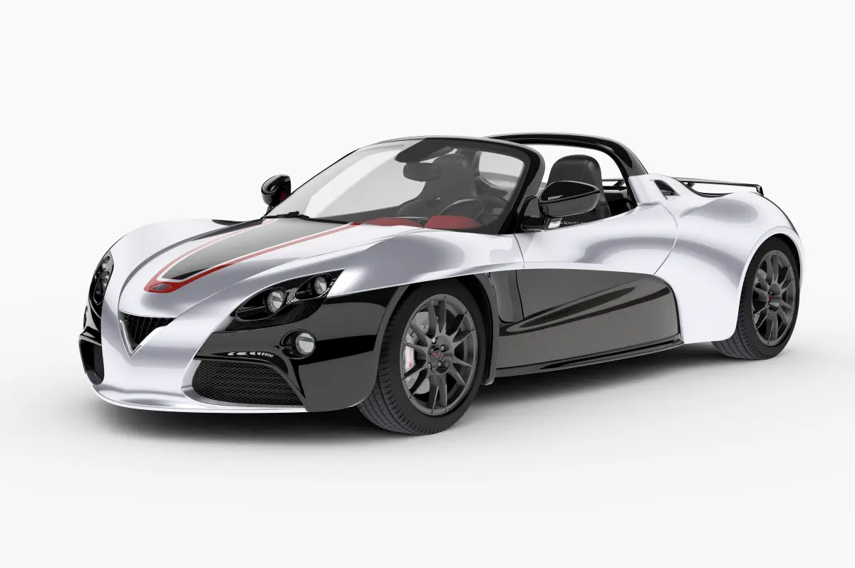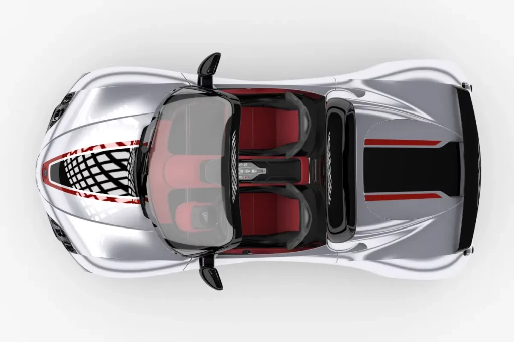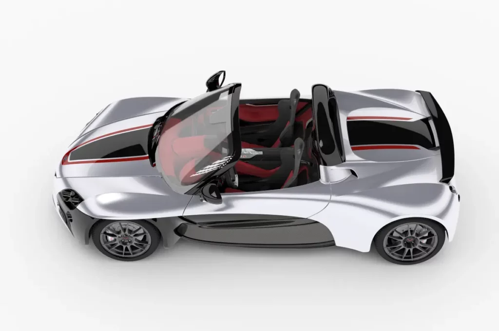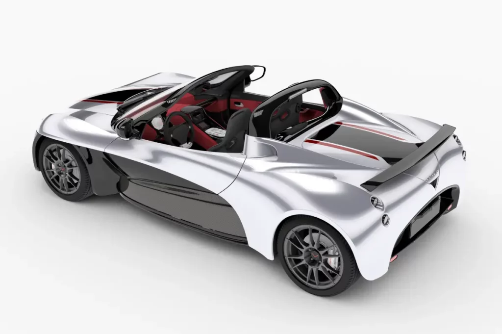 Fetish is a two seater roadster, rear wheel drive, central unit is made of aluminium and body work in carbon fibre