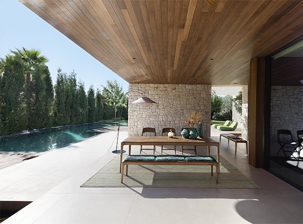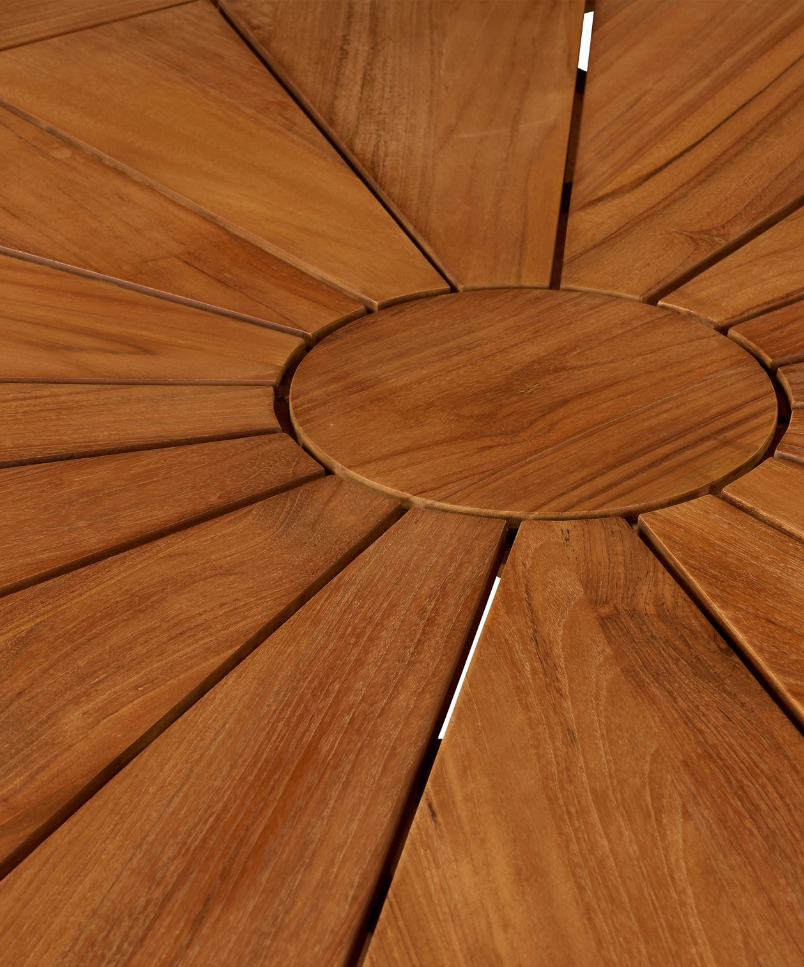 The AUREA collection is available in teak, the king of outdoor furniture woods. The sunburst tabletop, crafted using marquetry, is both warm and elegant. The wood used is FSC-certified and sourced exclusively from sustainably managed forests.
