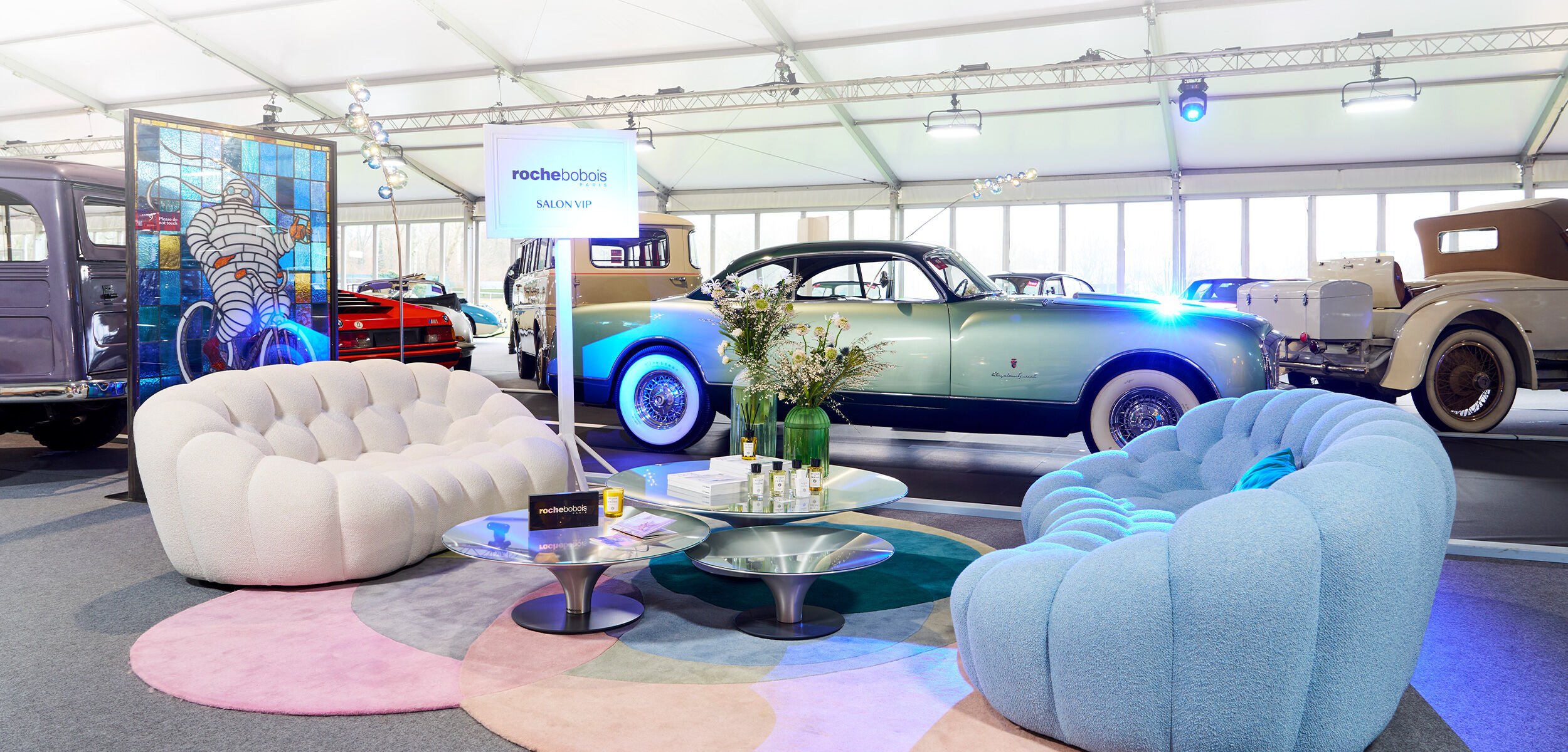 At the heart of the scenography, Roche Bobois unveiled the iconic Bubble collection by Sacha Lakic, whose bold, sculptural lines and enveloping forms echoed the aerodynamic curves and expressive silhouettes of the automobiles on display. This striking dialogue between avant-garde contemporary design and timeless mechanical artistry created a refined and immersive atmosphere throughout the venue.