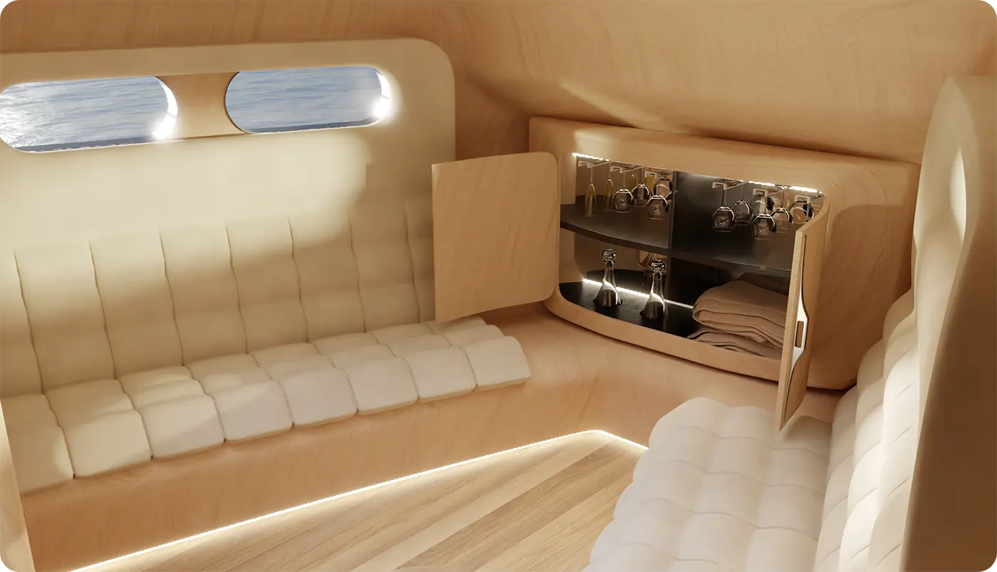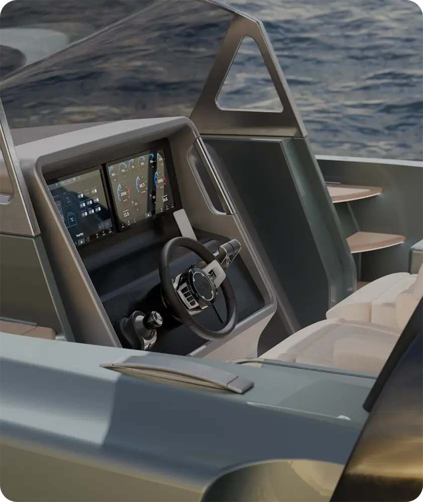 This 12-meter Tender/Chase Boat features pioneering retractable hydrofoils and an intelligent automatic management system, effortlessly lifting the vessel above the waves.